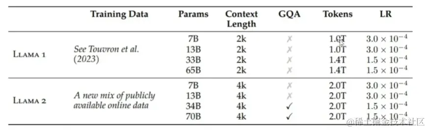 基于 LLaMA 的变种如火如荼,而基座 LLaMA 也没有闲着,在今年的 7 月份,LLaMA-2 来了。来看 LLaMA-2 相对于 LLaMA 的提升,如 Context长度、Tokens 基本都做了翻倍,所以 LLaMA-2 可以理解和生成更长的文本。