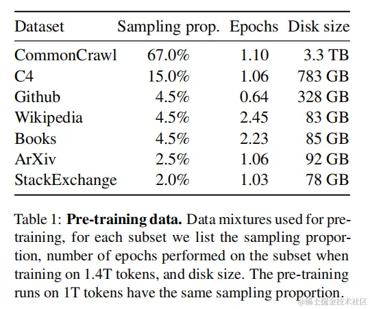 LLaMA 是 Meta 在今年 (2023年) 发布的基础 LLM 大模型,这个模型有四个版本,分别是 7B、13B、33B、65B (这样如果你后面看到哪些国产大模型差不多有这几个规格的,基本都是 LLaMA 的套壳模型)。其中 LLaMA 中的位置编码用的是旋转自编码 (RoPE),其实是一种典型的相对位置编码。相比之前的大模型,或者直接点,相比于 OpenAI 的 GPT,LLaMA 完全是在公共的开源预训练数据集上训练的。而且推理效率也是 LLaMA 的一个亮点,它可以在单卡 V100 上完成推理,这个相当有意义,这可以让大模型平民化,让大家都玩得起 (当然,这个是指推理,如果 LLaMA 训练的话,65B 模型的全量训练需要使用 2048 块 A100 80G 的显卡,训练 21 天左右,成本还是相当高的,当然要是微调的话不需要这么高成本)。LLaMA 的数据集分布如下,总共差不多 5T 的样子,这些都是公共开源的数据集。但比较遗憾的是,LLaMA 数据集大部分还是英文数据、西班牙数据等,所以对于中文的直接泛化能力并不是太好。