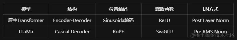 这样一来,在咱们国内的 "百模大战" 中,其实大部分的模型都是基于 LLaMA 的魔改,也就是大部分都是羊驼系列,比如鼎鼎有名的百川大模型,哈工大的华佗大模型等。所以,要说到羊驼系列模型的共性,其实都是基于羊驼模型的鼻祖 LLaMA 的套壳。首先先来看 LLaMA 的特点,LLaMA 说到底还是经典的一个词一个词往外蹦的模型,就是用前面的词预测下面的词,这个结构跟 GPT 是一致的。而且,像 LLaMA 这种大部分的大模型都会是以 Transformer 结构为基础架构的,所以这里拿 LLaMA 和 原生Transformer 模型结构做个对比: