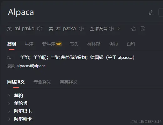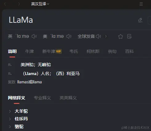 "羊驼模型" 在大模型的介绍中应该是经常会听到的,另外 LLaMA 也是经常会听到的,但是你可能不知道,所谓的 "羊驼模型" 其实就是指 LLaMa,而所谓的 "羊驼系列" 指的就是基于 LLaMA 的变体。而这并不是有什么特殊的原因,比如模型结构类似羊驼等,而是 LLaMA 直接翻译就是 "羊驼"、"美洲驼" 的意思,如下,