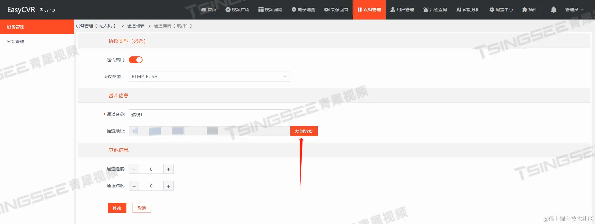 3)进入【编辑】页面,获取推流地址给无人机遥控屏进行推流即可。
