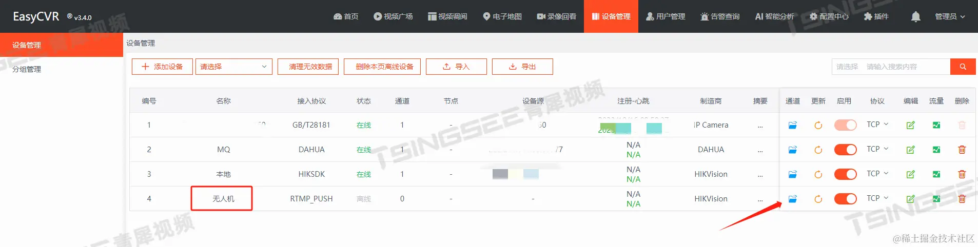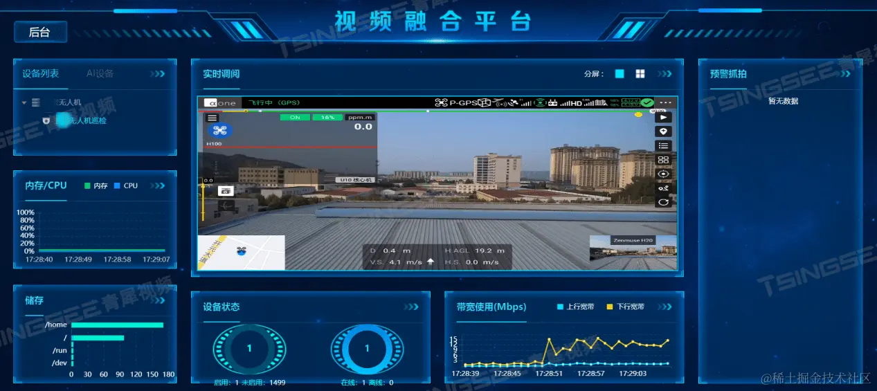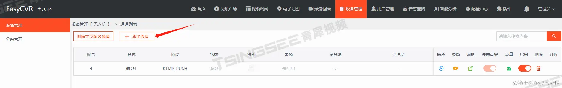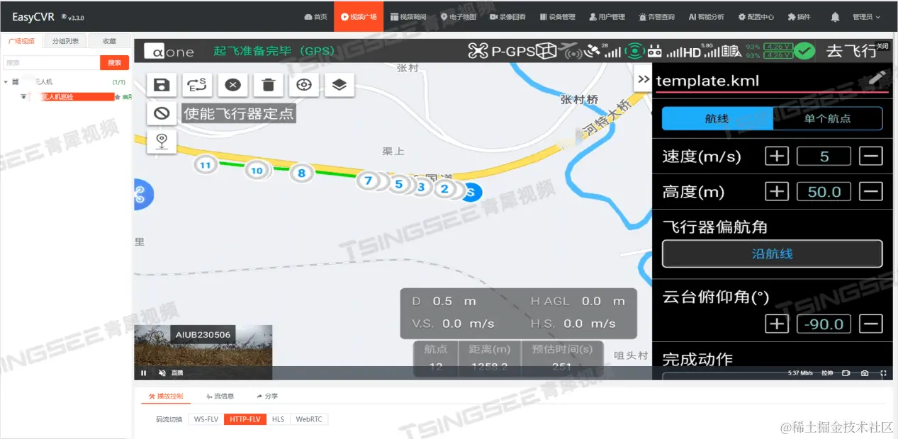 众所周知,无人机一般是支持推流的,旭帆科技的EasyCVR平台就可支持RTMP推流,从平台建立视频通道获取推流地址给到遥控屏,即可实现视频传输,效果如下: