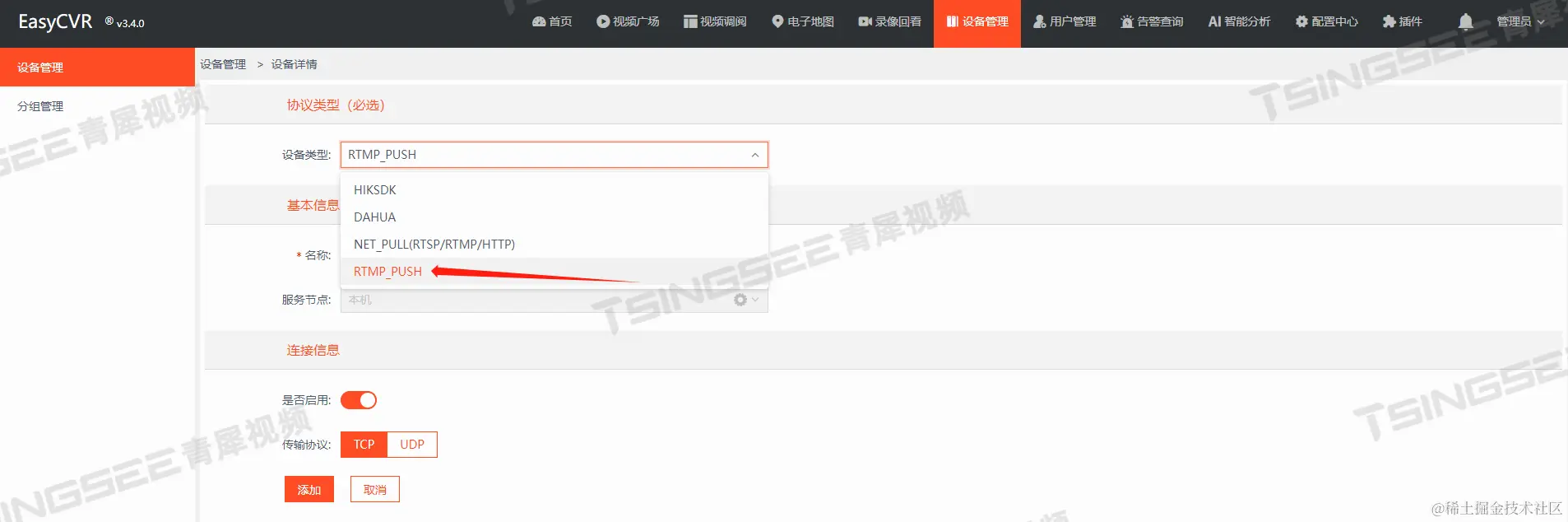 1)首先在EasyCVR平台【设备管理】中选择RTMP_PUSH协议,添加设备;