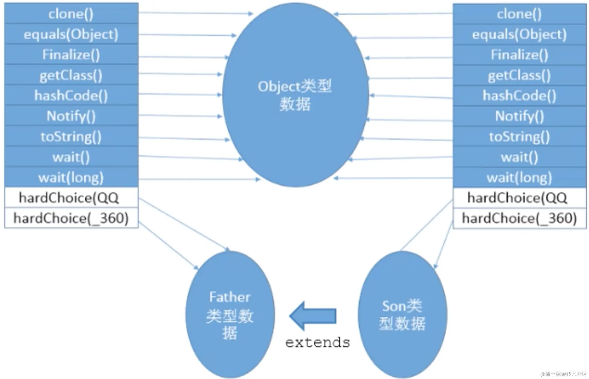 - 假设现在Son调用toString方法,由于Father没有重写,所以会直接找Object类型,不会再找到Father,hardChoice已经重写了,就直接是Son类型,不用再层层往上找