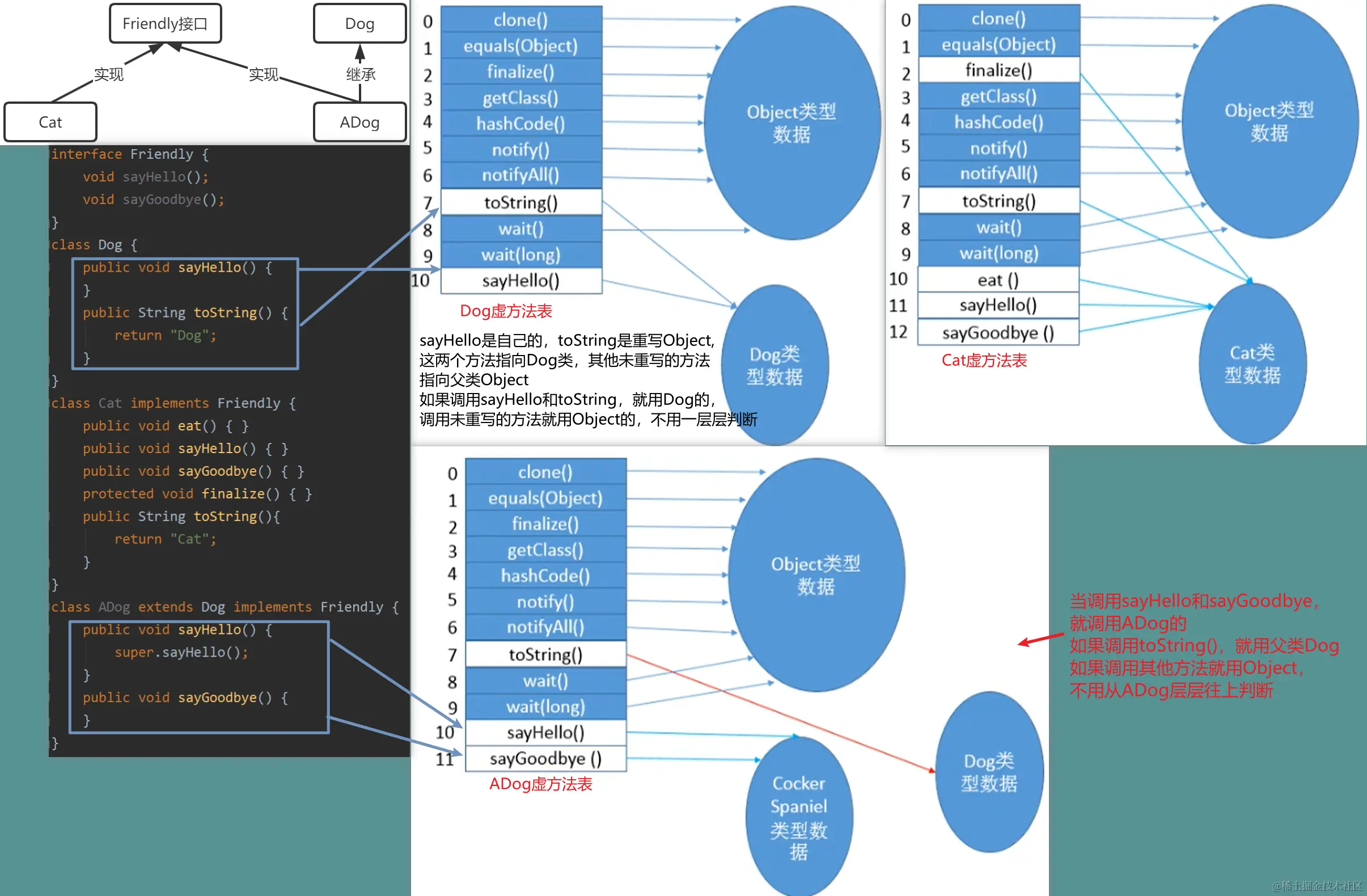 - 每个类中都有一个虚方法表,表中存放着各个方法的实际入口。