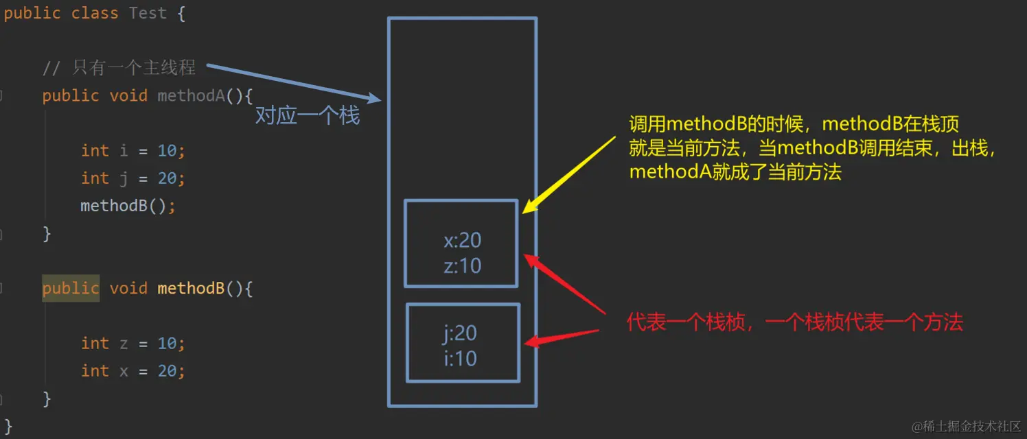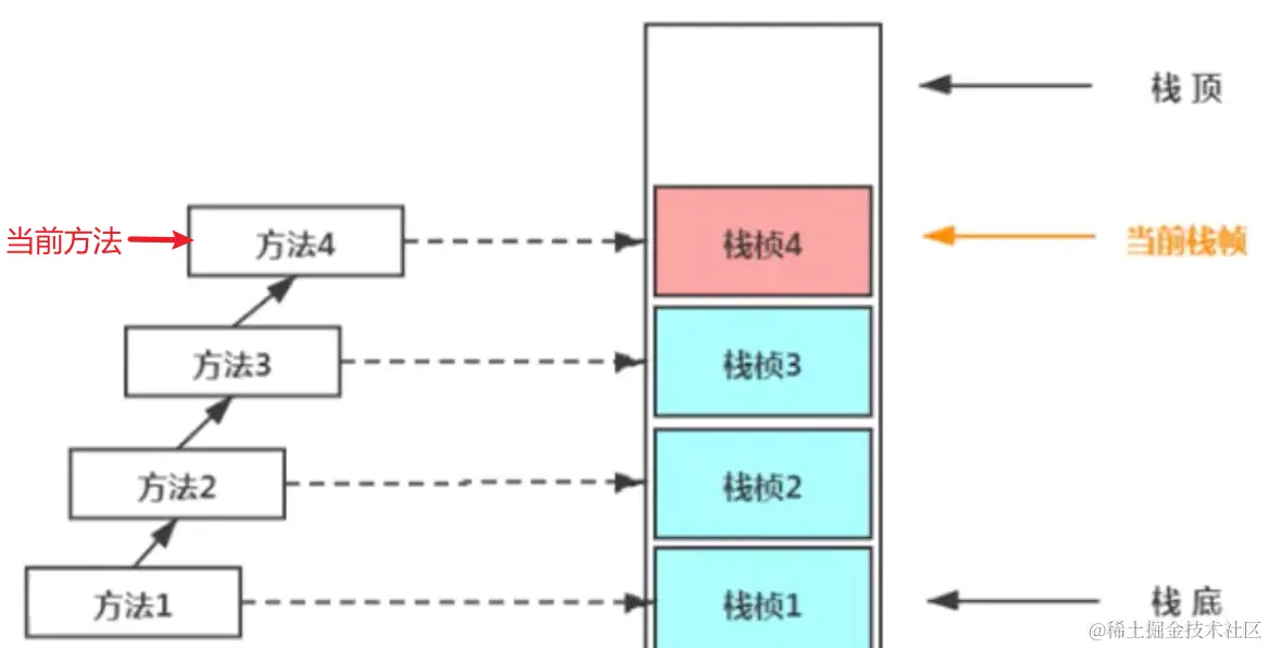 - 如果在该方法中调用了其他方法,对应的新的栈帧会被创建出来,放在栈的顶端,成为新的当前栈帧。