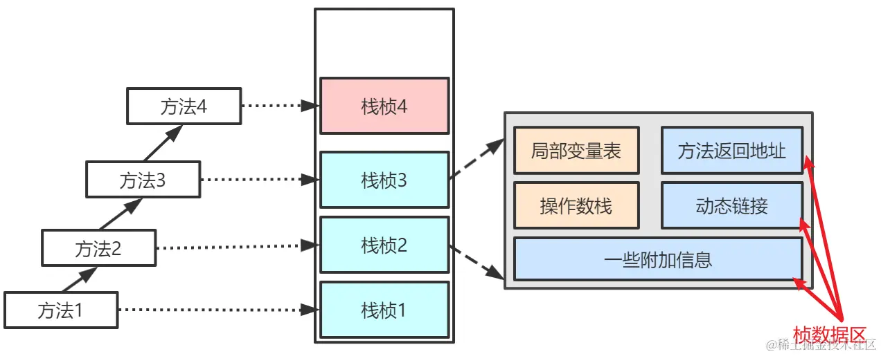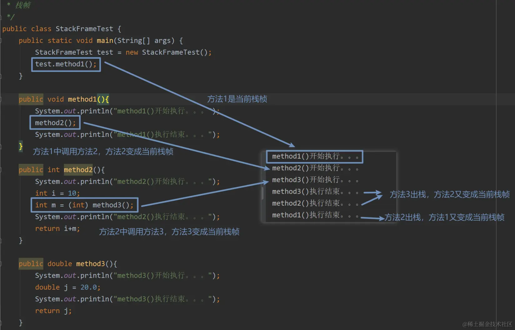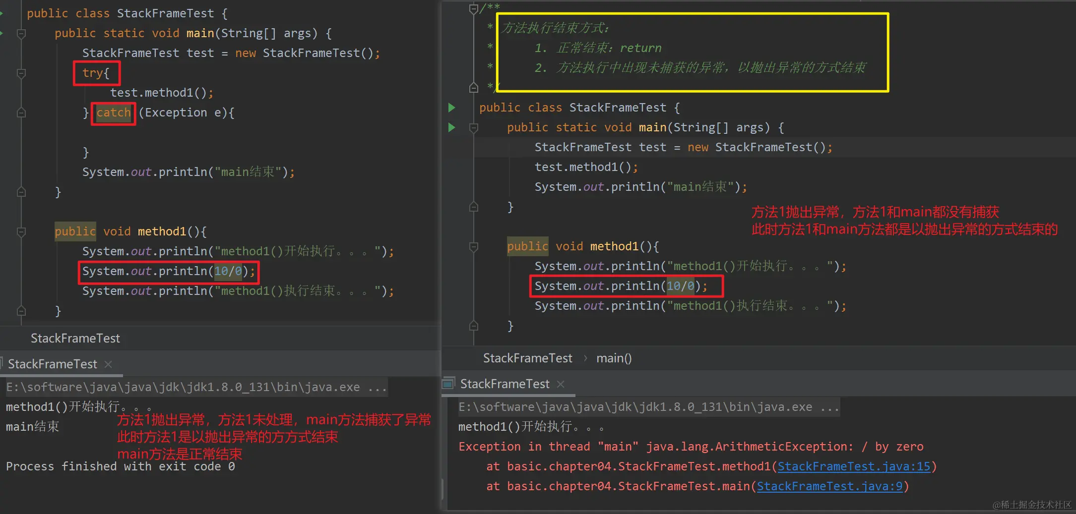 - Java方法有两种返回函数的方式,一种是正常的函数返回,使用return指令;另外一种是抛出异常(没有处理异常,try catch的话是已经处理了)。不管使用哪种方式,都会导致栈帧被弹出。