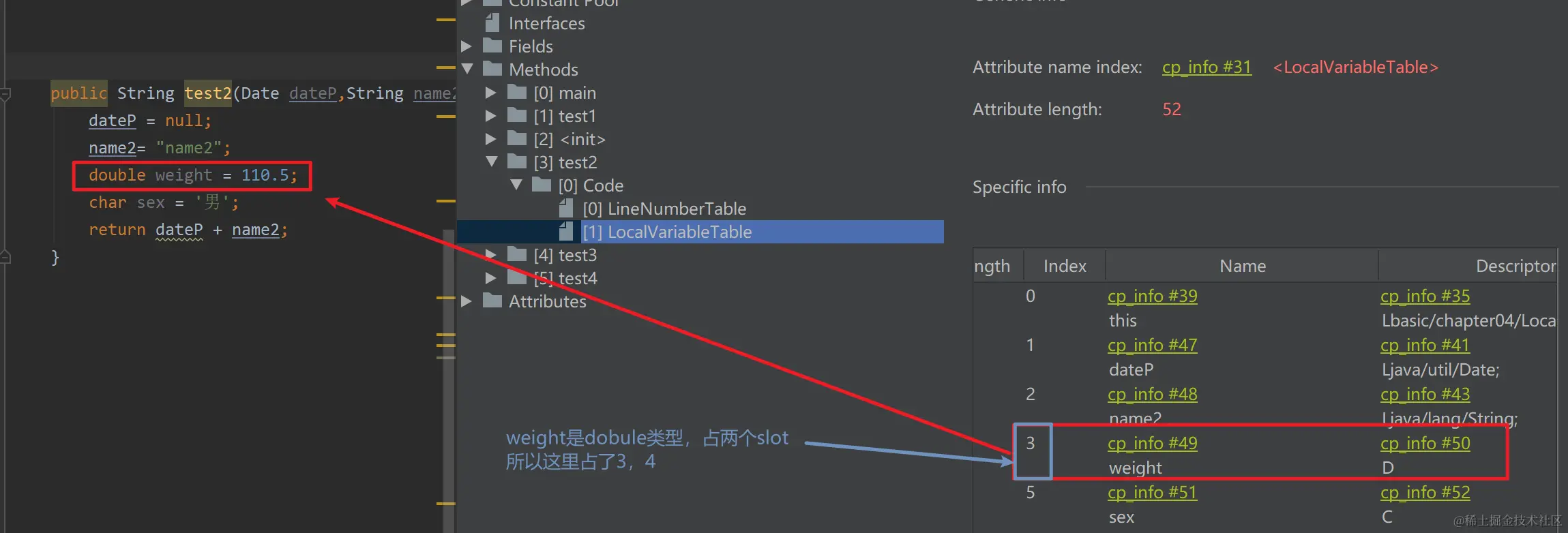 | long和double则占据两个slot,long和double占8个字节,一个字节8位,8*8=64。