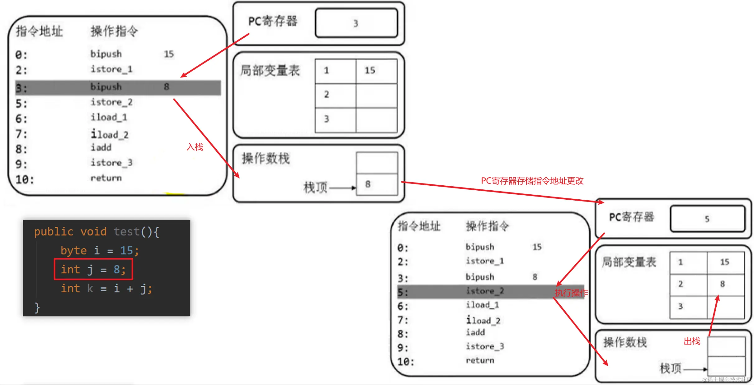 - 操作数栈,在方法执行过程中,根据字节码指令,往栈中写入数据或提取数据,即入栈(push)或出栈(pop)