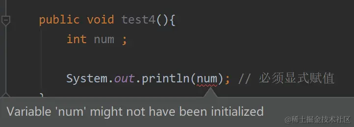 - 局部变量:在使用前,必须要进行显式赋值的!否则,编译不通过