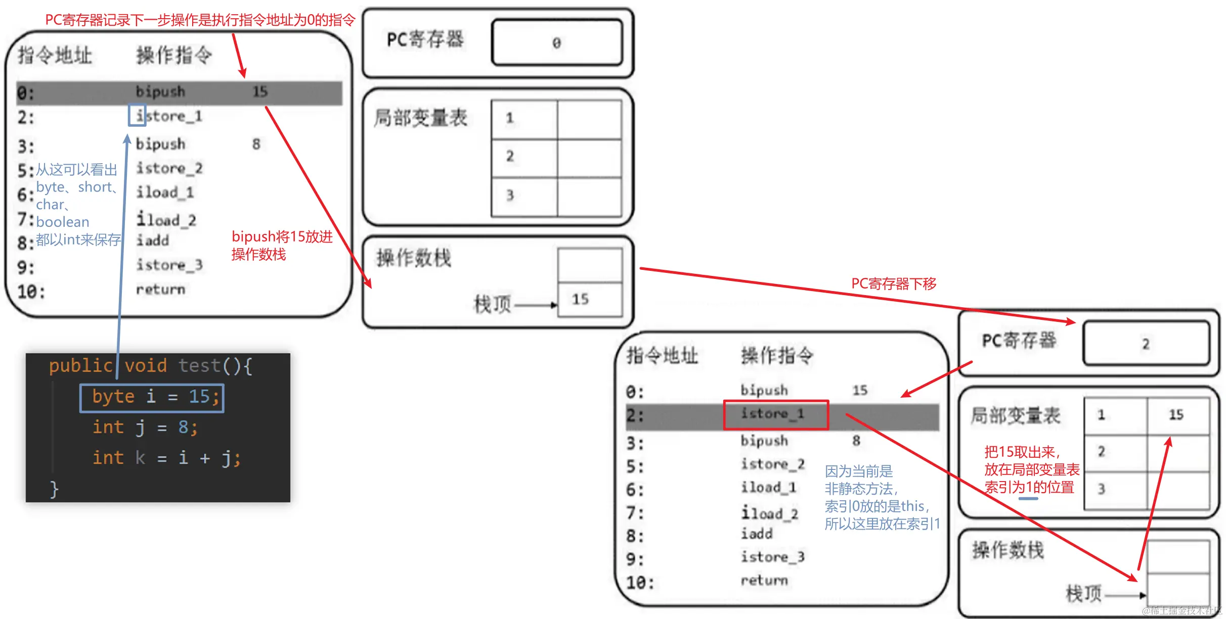 | 食材列表(局部变量表) —> 做法步骤(做菜的过程就可以理解为操作数栈的执行过程)