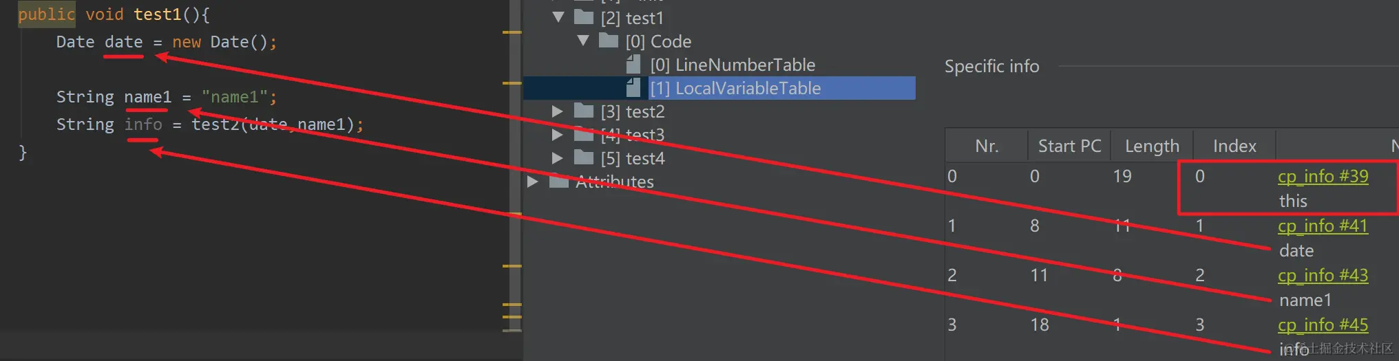 - 如果当前帧是由构造方法或者实例方法创建的(意思是当前帧所对应的方法是构造器方法或者是普通的实例方法,非静态),那么该对象引用this将会存放在index为0的slot处(会比静态方法多一个索引,index为0放了this),其余的参数按照参数表顺序排列。