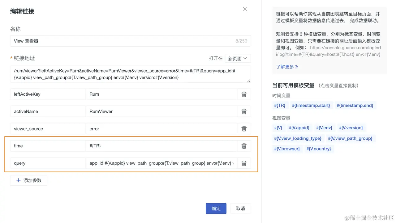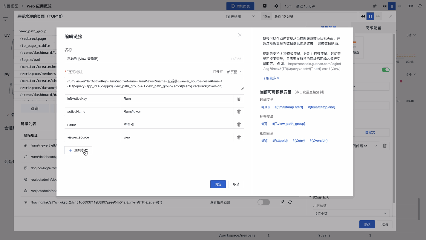 上文我们通过观测云的实际案例演示了如何通过图表链接功能完成仪表板和查看器联动下钻分析。如果您的使用场景中需要跟观测云以外的第三方系统进行跳转查看,观测云同样支持输入自定义的链接地址。自定义链接地址中所有的模板变量仍然生效,请按需使用。