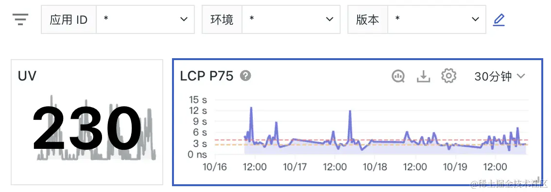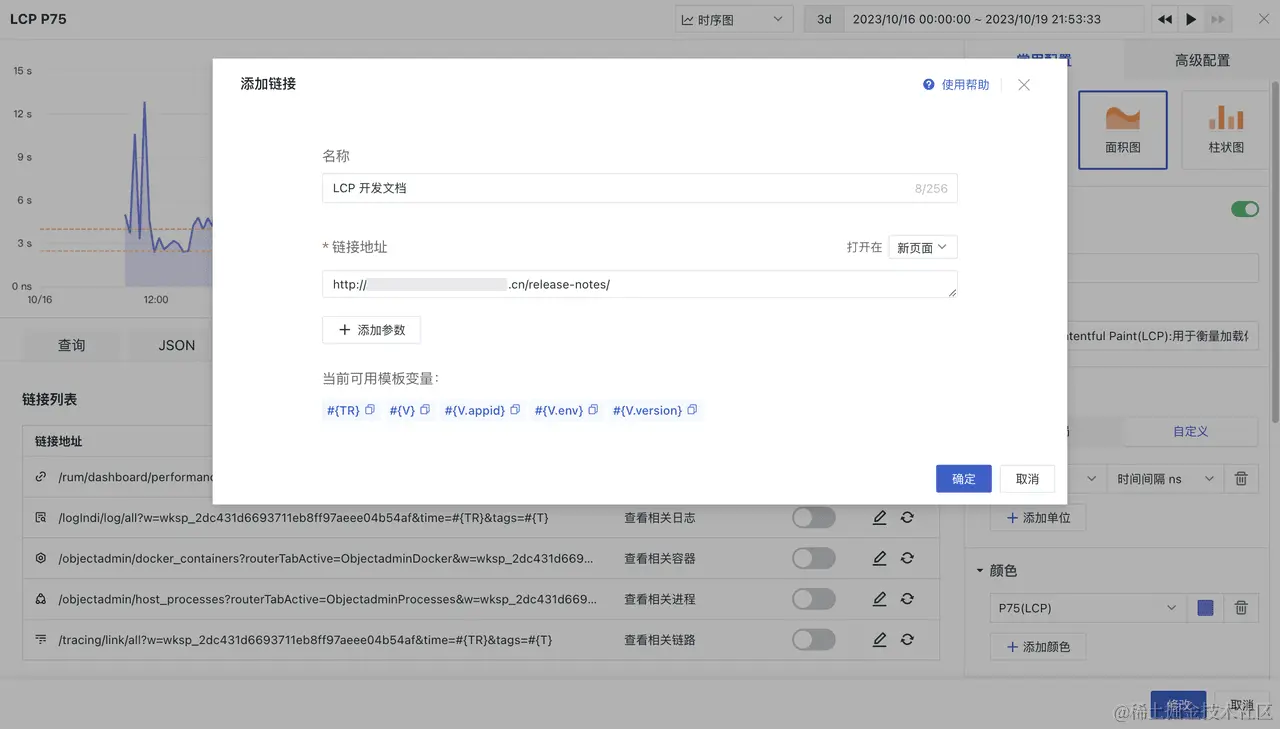 我们在【仪表板-Web 应用概览】假设一个场景:LCP 是前端性能一个衡量指标。在图表中可以看到起伏的趋势。此时,如果一个前端开发人员想要提高该性能指标,可以为该图表添加相应的外部开发文档链接。从而,等到后续问题发生时,即可直接跳转去外部文档,及时解决问题。