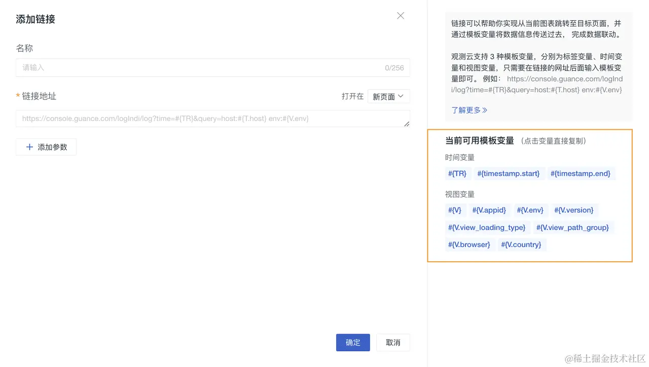 | #{V.name} | 当前仪表板中某一个视图变量的值,name 可替换为任意变量名。 假设当前仪表板的视图变量 version=V1.7.0,则: 模板变量 #{V.version} = V1.7.0 &query=version:#{V.version} 等同为 &query=version:V1.7.0。 | |