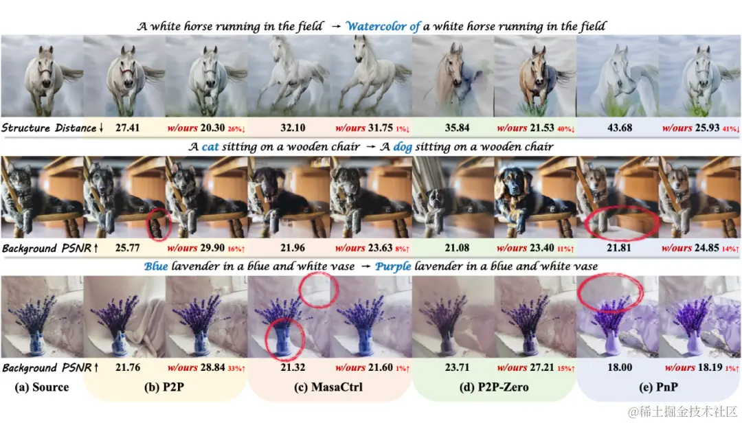 但这种做法是存在问题的:1. 优化相当于在推导过程中训练,非常消耗时间,比如 Null-Text Inversion 通常需要两三分钟编辑一张图片;2. 优化存在误差,因此不能完全消除“偏差”,如图 2 Null-Text Inversion/StyleDiffusion 中画出的,保留分支与原始 inversion 分支之间的偏差只是被缩小并没有被消除,这就使得重要信息的保护没有发挥到最大限度;