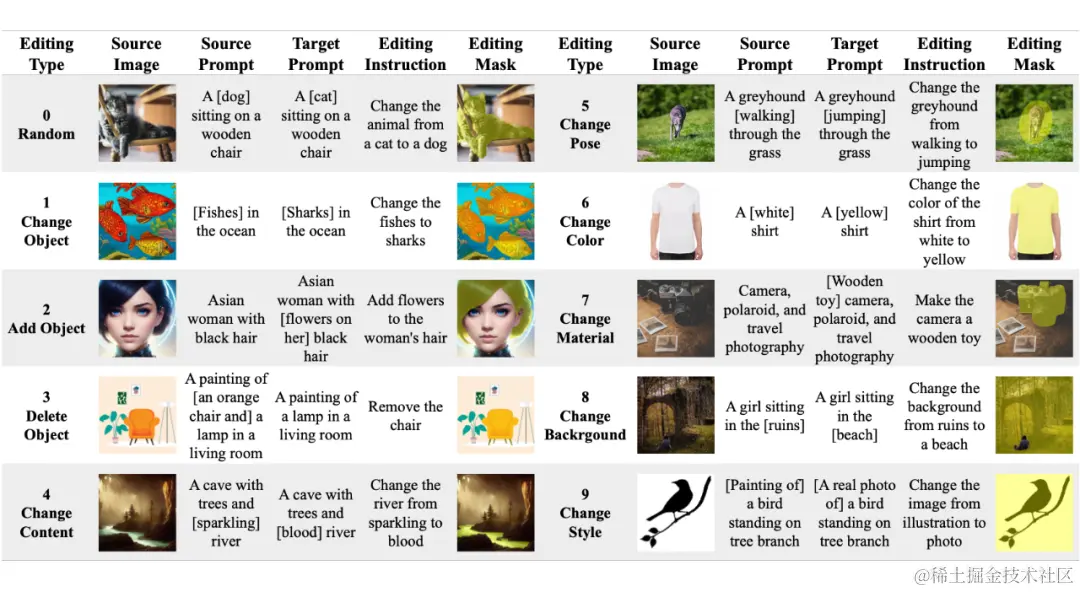 尽管基于 Diffusion 的编辑在近几年引起了广泛关注,但各类编辑方法的评估主要依赖于主观且不确定性的可视化。因此这篇文章为了系统验证所提出的 Direct Inversion,并对比过往 Inversion 方法,以及弥补编辑领域的性能标准缺失,构建了一个基准数据集,名为PIE-Bench(Prompt-based Image Editing Benchmark)。PIE-Bench 包括 700 张图像,涵盖了 10 种不同的编辑类型。这些图像均匀分布在自然和人工场景(例如绘画作品)中,分为四个类别:动物、人物、室内和室外。PIE-Bench 中的每张图像都包括五个注释:源图像提示语句、目标图像提示语句、编辑指令、主要编辑部分和编辑掩码。值得注意的是,编辑掩码注释(即使用一个 mask 指示预期的编辑区域)在准确的指标计算中至关重要,因为期望编辑仅发生在指定的区域内。