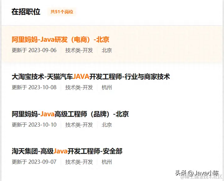 经济大环境下虽然不可否认的是岗位有所减少,2021年甚至阿里等大厂都有裁员的情况,但是他们对JAVA岗位也一直在招人: