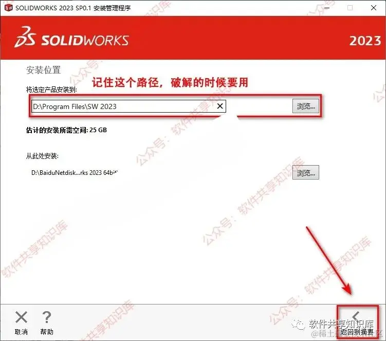 17.自定义软件的安装路径,注意路径不要有中文,然后点击返回摘要。