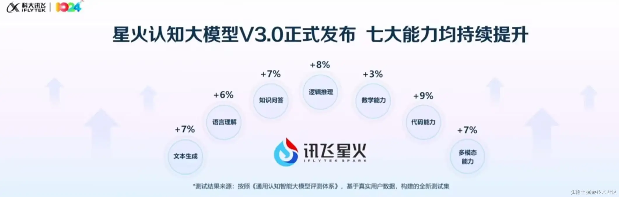 下面他介绍了大模型的七大能力的提升:文本生成7%,语言理解6%,知识问答7%,逻辑推理8%,数学能力3%,代码能力9%,多模态能力7%