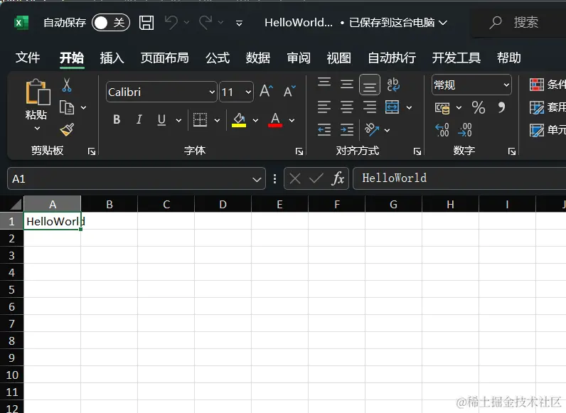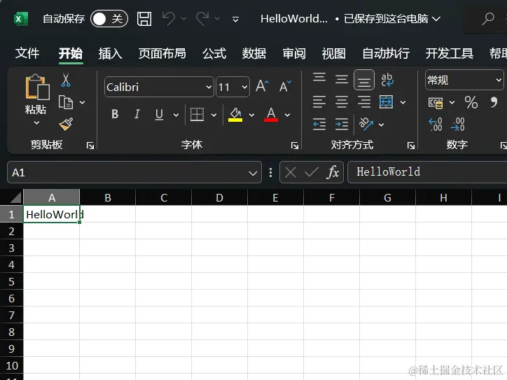 (4)运行项目,生成一个名为HelloWorld.xlsx的Excel文件,如下图所示: