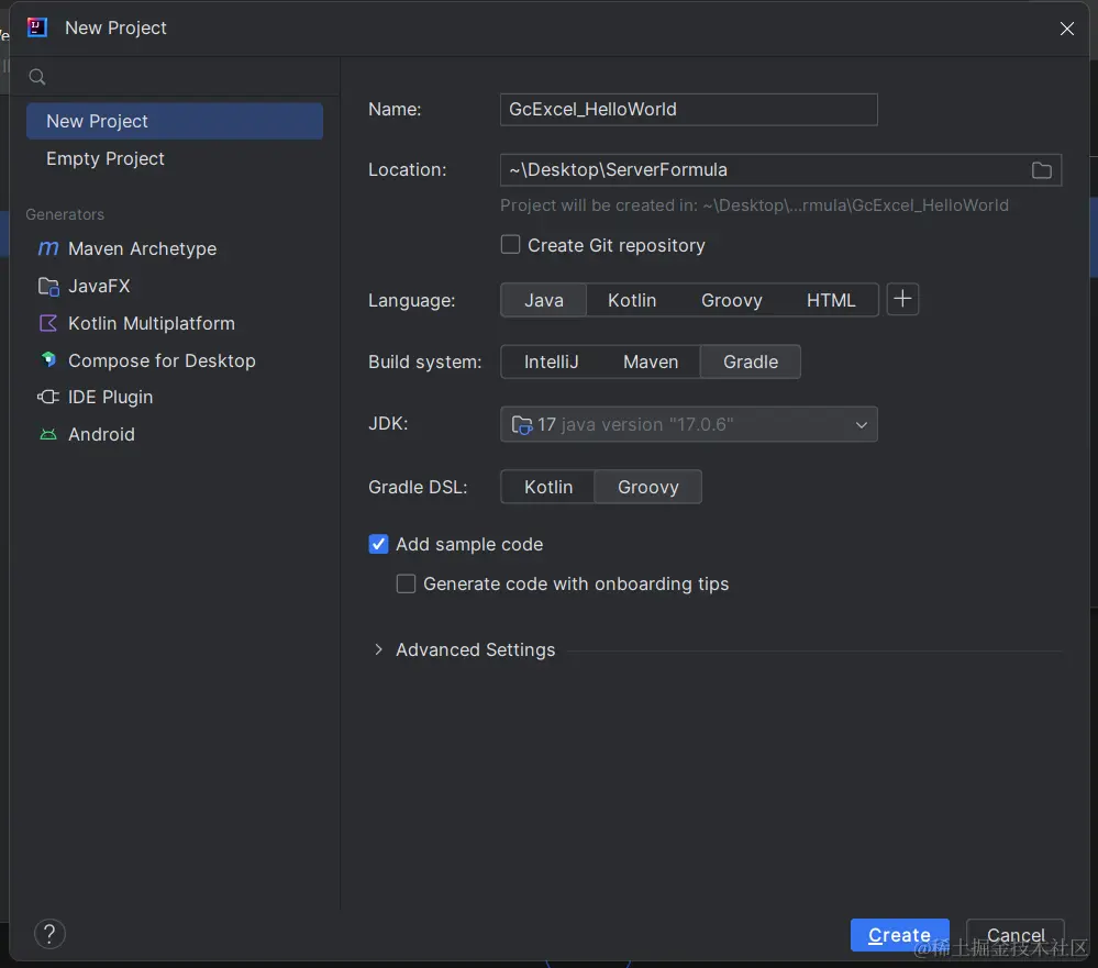 (2)将项目起名为 GcExcel_HelloWorld,构建工具选择 Maven 或者 Gradle。