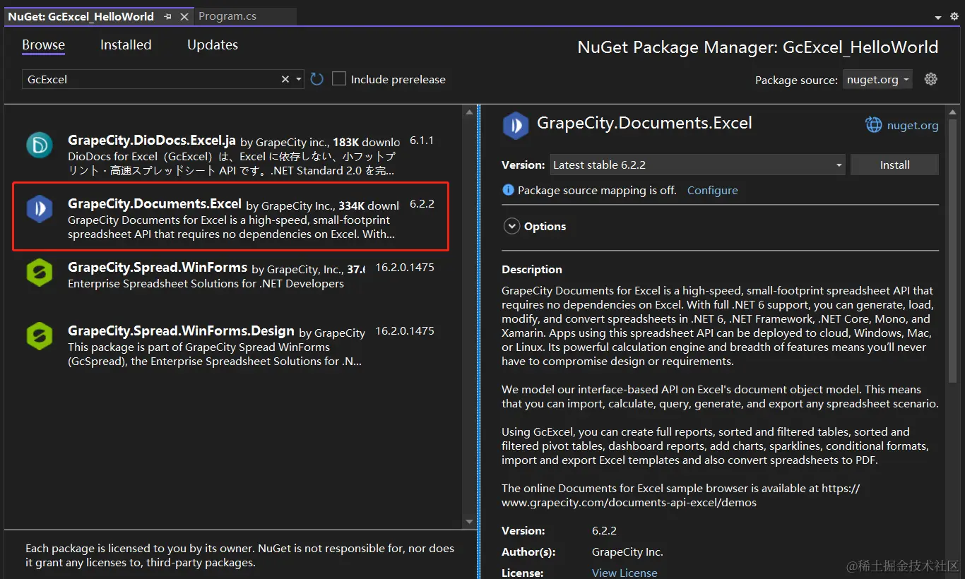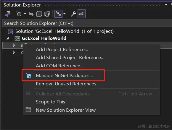 (2)通过Visual Studio community的 NuGet Package Manager 来添加 GcExcel。