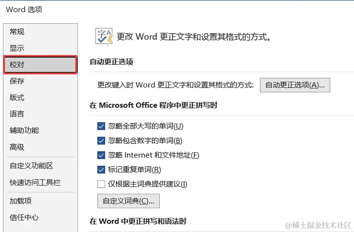 第一步:同样选中我们的文本,在顶部菜单栏中,点击 “文件” 选项,然后选择 “选项” 。在弹出的窗口中,选择 “校对” 选项卡。