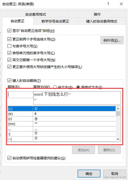 我们还可以使用自动修正功能,来为我们自动加上下划线。以下是具体的步骤: