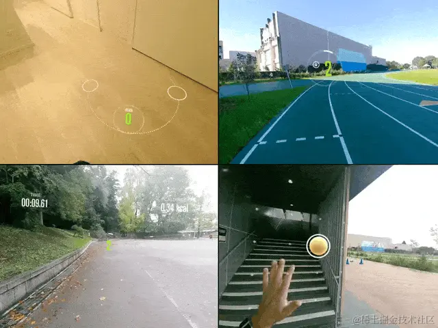 我们可以看到点击事件后界面的翻转,捏和使用放大镜,界面随着手指移动等,同时我们也看到了类似 Meta 提出的 pinch-and-pull 交互方式。同时 dmvrg 还设计了一套 健身专用的 UX 界面,比如引导用户把手放在正确的俯卧撑位置,通过虚拟目标的引导让健身更有趣。(虽然我们不建议大家用目前的头显去做这些动作)类似的应用我们曾在去年的 ADA 上有见到:活力街