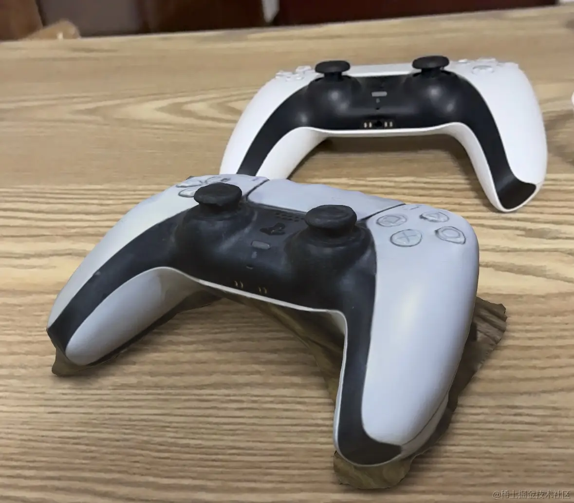 不过,对于普通人来说,即便是手机上产出的较低精度的模型,大部分情况下也基本可以“以假乱真”了,比如,看看下图中的两个 PS5 手柄,你能猜到哪个是真的,哪个是假的吗?