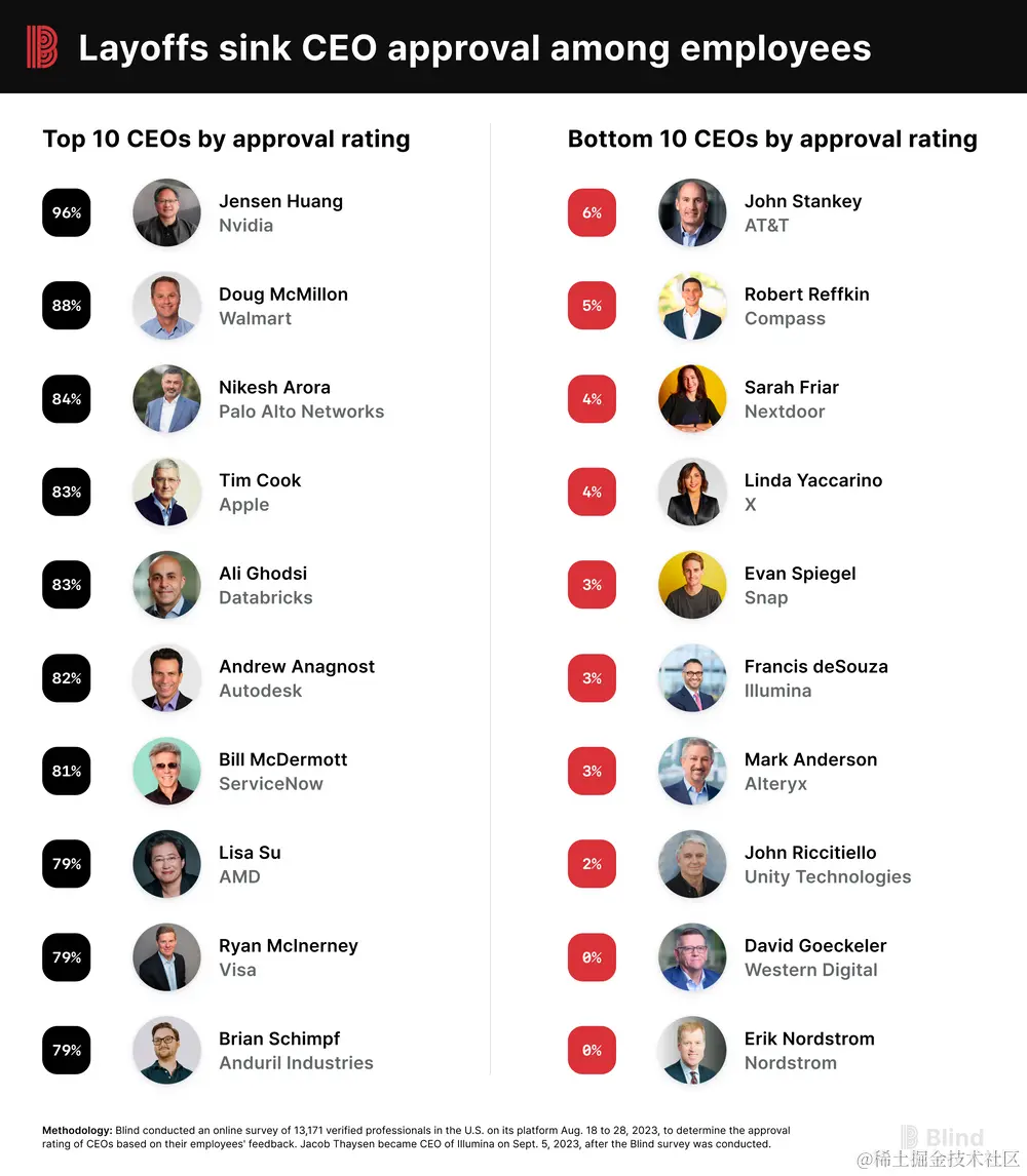 无独有偶,之前 Blind 做的一次最受欢迎的科技公司 CEO 调查 中,John Riccitiello 排名垫底(只有 2% 的支持率)
