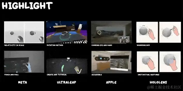 在 手势交互 的系列推文中,dmvrg 为我们分享了一些现有各家公司对于手势交互的设计原则/建议,我们可以从已有的资源了解和对比各家公司对于手势交互的设计原则,虽然有很多设计还是针对二维界面的设计,比如对于 UI Window 的放缩以及对于 UI Winodw 本身的放缩,但是有一些针利用手势直接对物体交互的方式值得参考: