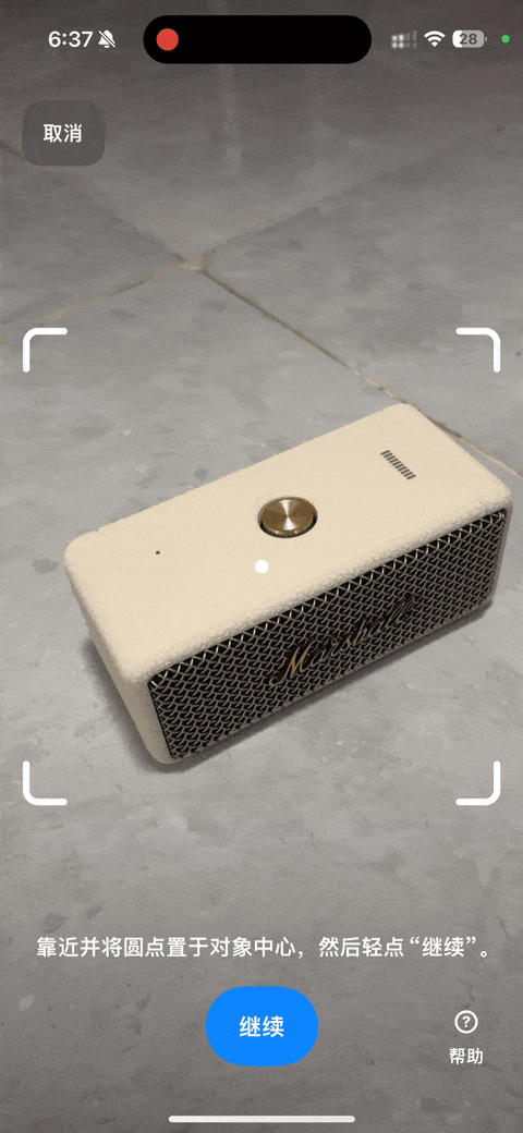 而在 iOS 17 上,Apple 不仅将照片处理的功能带到了手机上(细节可以查阅 Meet Object Capture for iOS 这篇文章),还提供了对应拍照体验全新升级的 官方 Demo,比起原来没有任何指导的直接拍照,此次官方 Demo 的拍照流程有了一个圆环来帮助用户了解照片的获取进度。