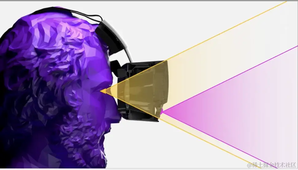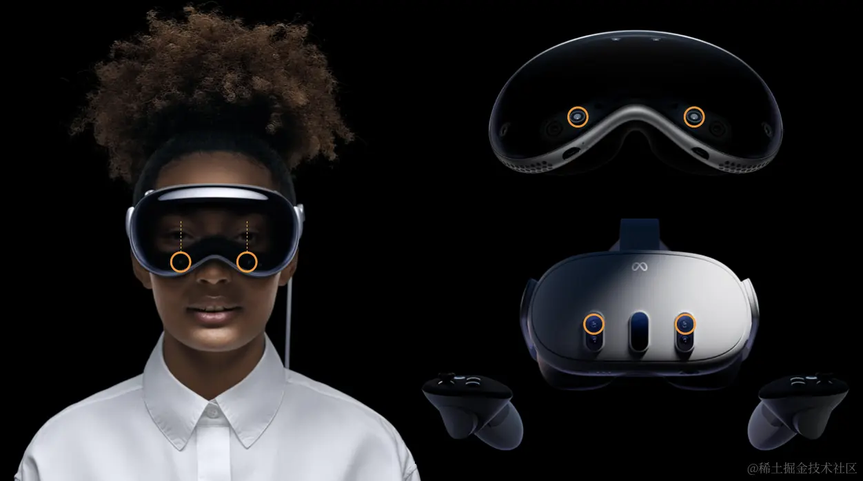 在 VST 的头戴式显示设备中,这个问题将会影响基本的使用体验,我们可以看到 Apple Vision Pro 的设计直接将两个用于画面采集的主摄像头放置在平均瞳距下方,Meta Quest 3 的 MR 彩色透视摄像头也从 Quest 2 的两侧移动到了平均瞳距的位置。(详见上一期 细节解析 Meat Quest 3 在 MR 技术上的那些升级)。