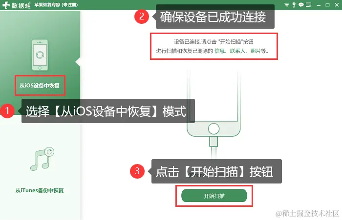 步骤3:当页面显示设备已经成功连接后,选择【从iOS设备中恢复】模式,然后点击【开始扫描】就可以了。