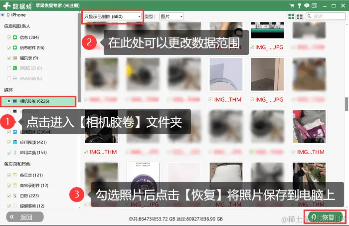 步骤3:数据扫描完成后,后续操作跟第一种恢复模式相同。在【相机胶卷】中勾选想要恢复的照片,最后点击【恢复】将照片保存在电脑上即可。