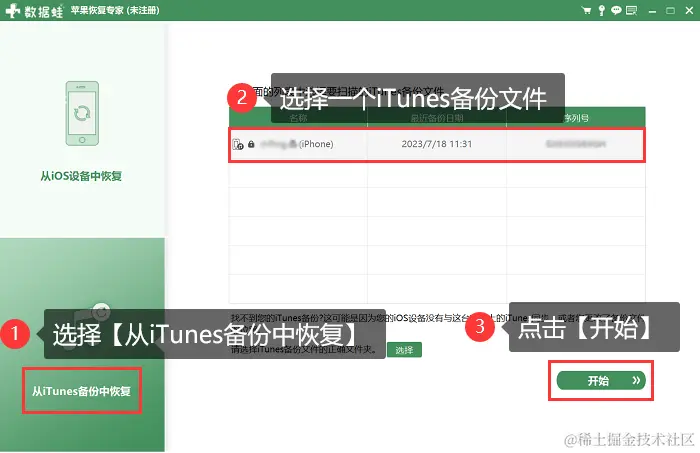 步骤1:返回软件首页,选择【从iTunes备份中恢复】模式,然后在备份列表中选择一个您想要进行扫描的文件,选择完成后,请点击右下角的【开始】按钮。