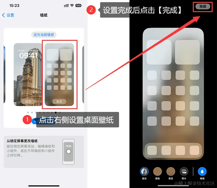 步骤2:在该页面里,您可以通过颜色、渐变、模糊来将桌面壁纸设置成自己喜欢的风格。也可以直接点击【照片】进行自定义设置。设置完成后,点击右上角的【完成】按钮就可以了。