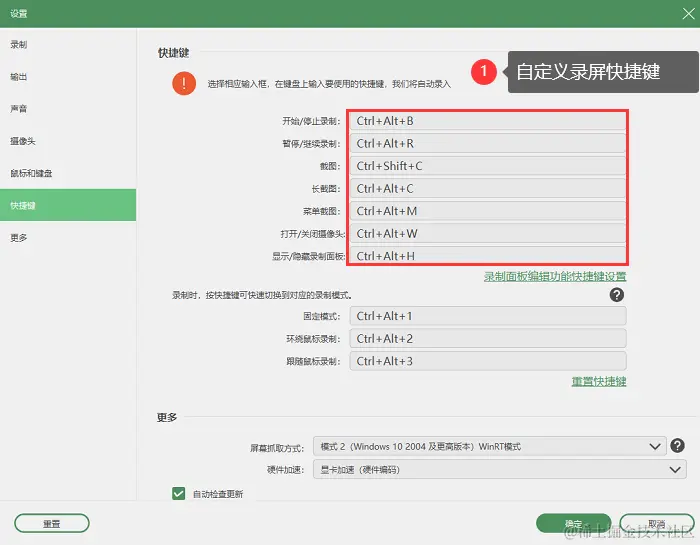 步骤3:您可以通过快捷键 “Ctrl+Alt+B” 快速开启录屏,在右上角可以进入快捷键设置页面,这里可以根据您的习惯自定义录屏快捷键。