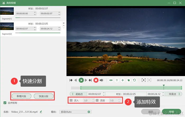 步骤4:完成录屏后,视频会弹出预览,在 “高级剪辑” 功能页面,我们还可以对视频进行快速分割、添加特效等多种操作。