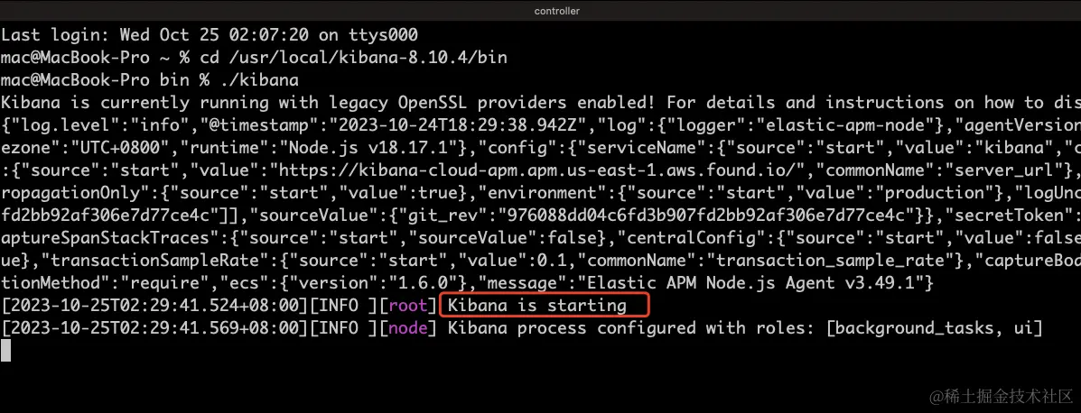 进入 /usr/local/kibana-8.10.4/bin 目录,使用命令启动(注意前面不要加sudo,因为es 不允许root账号访问)