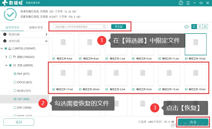 4.深度扫描作为软件的第二次扫描会对磁盘进行更深度的扫描,此时被扫描到的数据会比较多,如果需要恢复的文件类型也比较多,可在 【筛选器】 中对文件进行限定,完成选择后点击【恢复】 。
