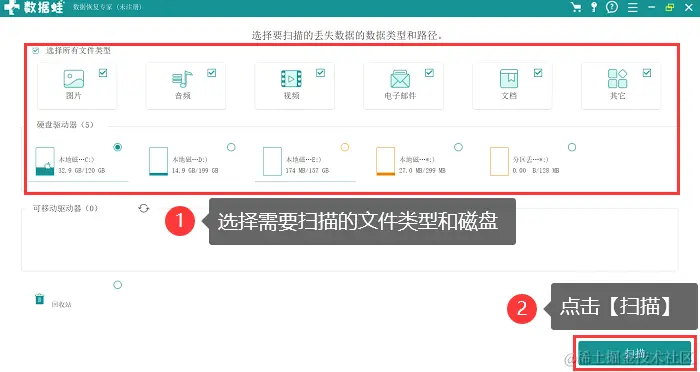2.对需要扫描的文件类型(即你所丢失的文件类型)进行勾选,并对需要扫描的磁盘(即所需恢复的文件删除前所在磁盘)进行勾选,完毕后点击 【扫描】 ;