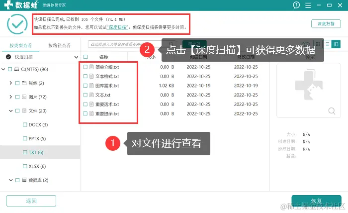 3.软件第一次扫描是快速扫描,等待扫描完成,软件会呈现小部分扫描到的数据,此时可以按照不同的文件类型对数据进行勾选,如果没有找到需要恢复的文件类型,点击 【深度扫描】 ;