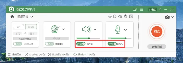 步骤2:在视频录制模式中,可以设置录屏的声音,扬声器对应电脑内部声音,麦克风对应电脑外部声音,可以根据自己的需求进行开启。