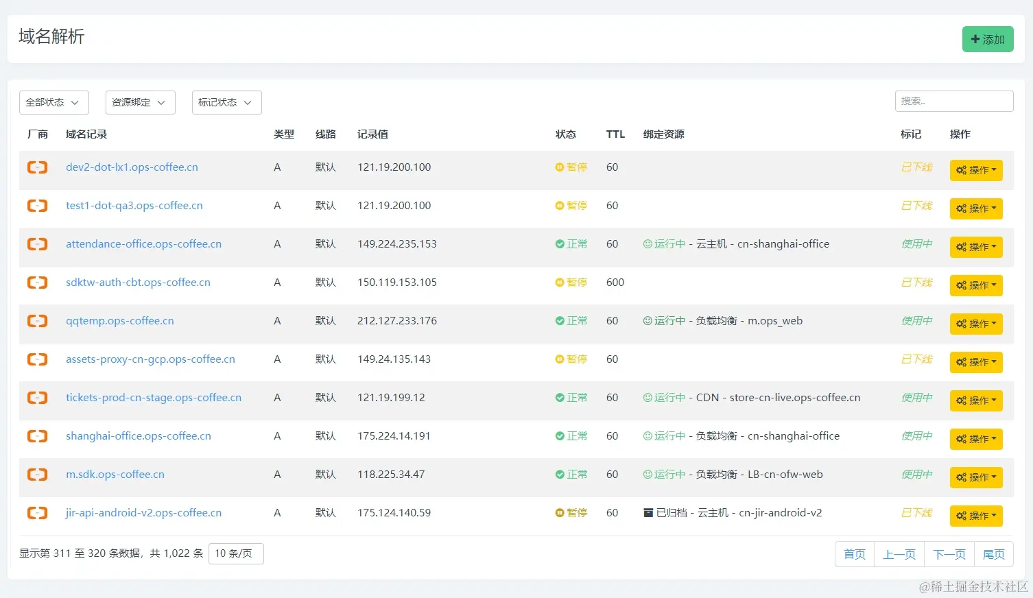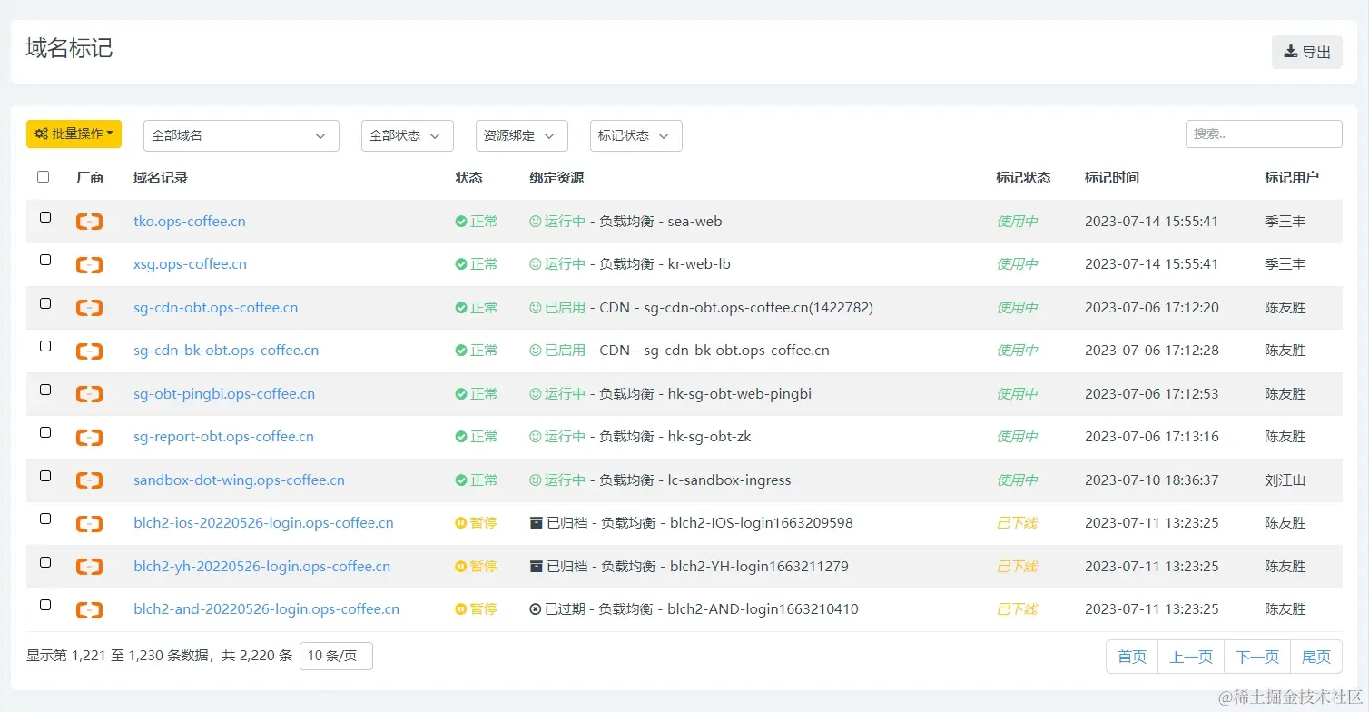 前文多次提到标记和盘点,所谓盘点就是对我们所有使用的域名做一次全面的梳理,确定哪些域名记录有在使用,而哪些域名记录已经不用了,这里通过系统判断加人工确认的方式来实现,例如之前说的,如果域名解析没有绑定资源或是域名绑定资源已过期,那多半域名解析已经不在使用了,这时候可以标记域名解析状态为已下线,等待后续确认删除
