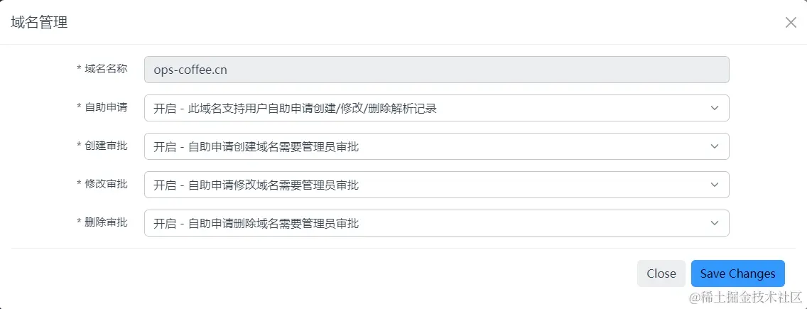 当然对于一些测试之类非核心域名也支持跳过审批自动处理,或者是根据具体的动作来选择跳过审批过程,例如默认新建域名无需审批,这个要根据具体的域名来配置了,充分考虑安全性和灵活性