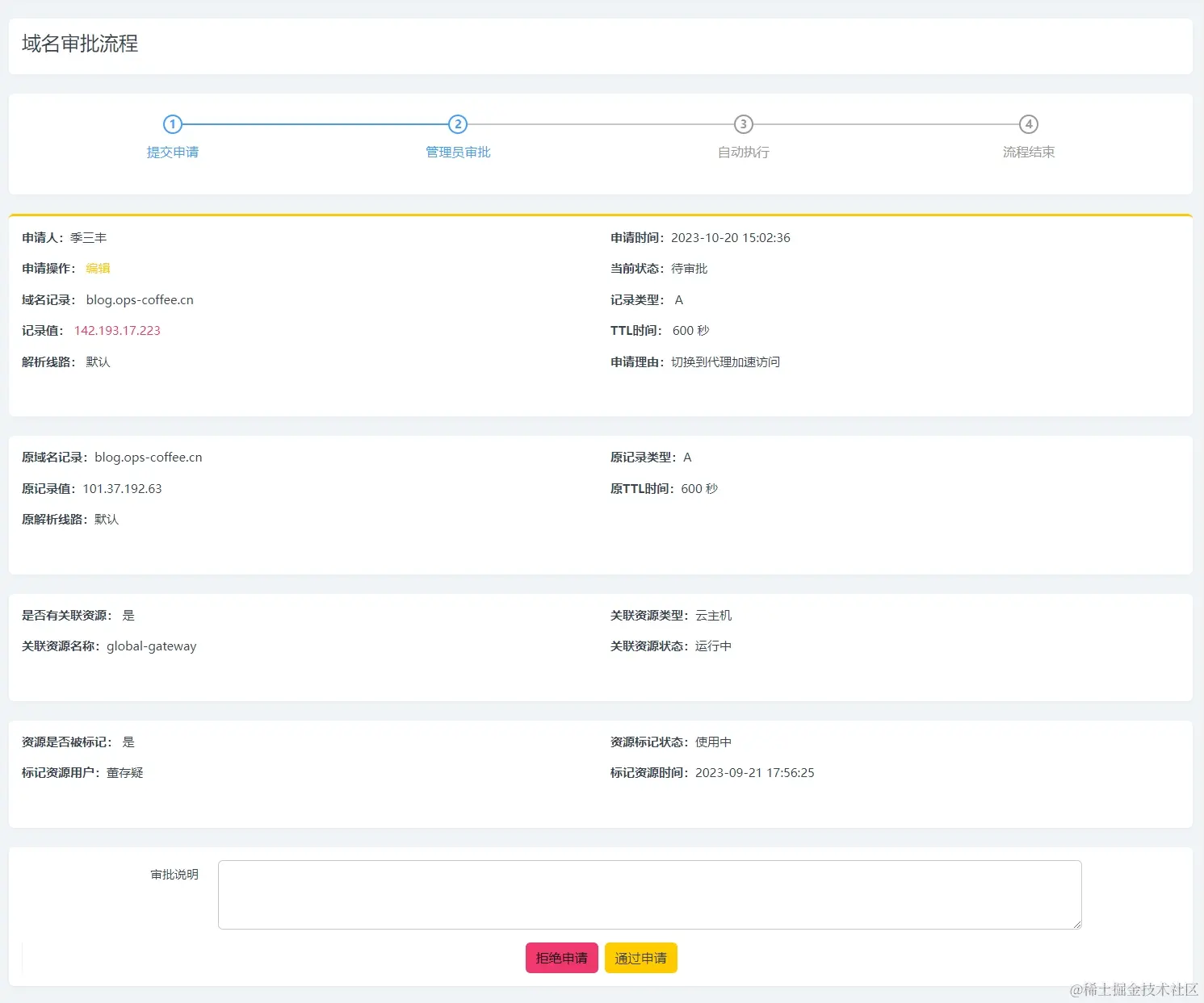新建/启用/停止/编辑/删除操作直接触发工单流程,用户提交,域名管理员二次确认,没有问题审批通过,则自动触发域名变更的操作。当然在确认的过程中一样可以展示域名关联的信息,例如关联资源、标记状态,给管理者充足的信息来帮助确认是否应该给与申请通过