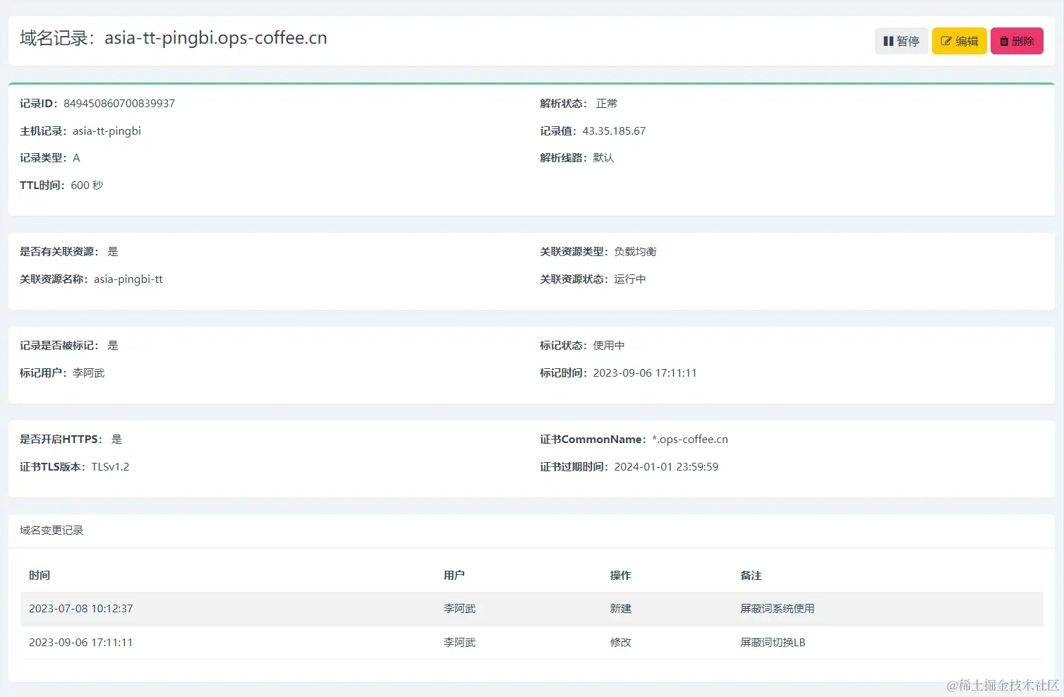 域名变更管理流程上线后也可以跟域名记录标记关联起来做自动标记,用户新申请域名解析申请通过创建成功后,则直接标记域名记录为域名解析的申请用户即可,这样域名盘点工作量将大大降低